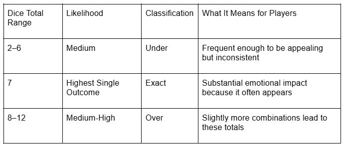 To help beginners visualize the math behind the dice, here’s a simple breakdown of how totals usually behave. These patterns don’t predict outcomes but give players a sense of what to expect in the long run.