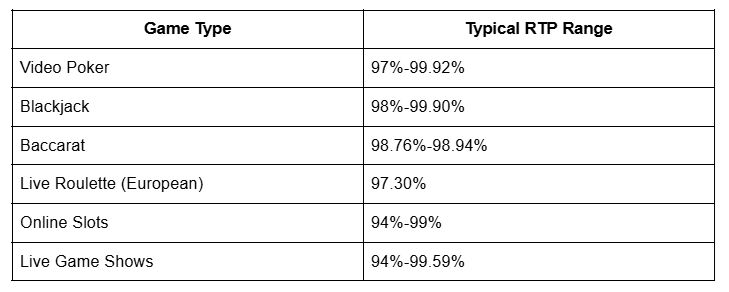 RTP varies substantially across different casino game categories. The table below outlines typical ranges by game type.