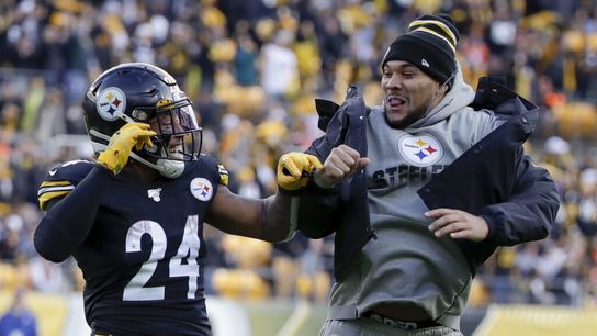 Pittsburgh Steelers running back Benny Snell (24) leaps in celebration with injured running back James Conner (30) after he scored against the Cleveland Browns during the second half of an NFL football game, Sunday, Dec. 1, 2019, in Pittsburgh. (AP Photo/Gene J. Puskar)