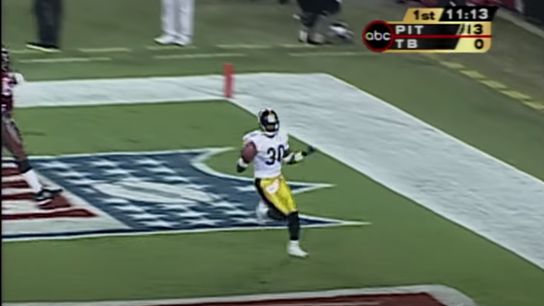 Joey Porter would sack Johnson on the next Tampa possession to help force them to another three and out. Coach Bill Cowher would turn the game over to Jerome Bettis from there. Seven straight runs by Bettis on the next possession would run over five minutes off the clock. They'd eventually fail on a fourth down conversion and Tampa would take over. With the Steelers in prevent defense, Tampa would drive down the field for their only points of the game. Johnson would find big mouth Keyshawn Johnson for an 18-yard touchdown and it was 17-7.