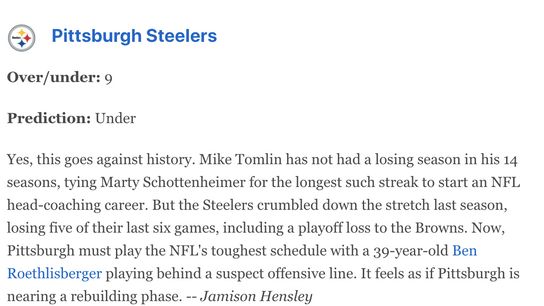 Third issue - there is no real rationalization as to why they believe the Steelers will go under. When reading a prediction from a credible source, you expect some sort of meaningful analysis. However, just stating that quarterback Ben Roethlisberger is 39 and they have a tough schedule doesn't provide great insight into the mind of the reporter. I have no issue with a person having a stance on topic, but at least expand on why you have that stance for the reader to understand why you made a decision.