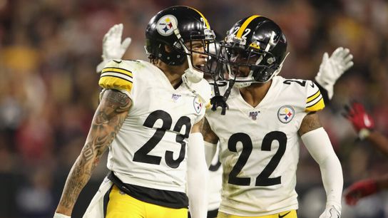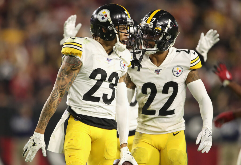 GLENDALE, ARIZONA - DECEMBER 08: Cornerback Joe Haden #23 of the Pittsburgh Steelers celebrates with cornerback Steven Nelson #22 after an interception against the Arizona Cardinals during the second half of the NFL game at State Farm Stadium on December 08, 2019 in Glendale, Arizona. The Steelers defeated the Cardinals 23-17. (Photo by Christian Petersen/Getty Images)