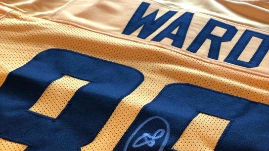 If you recall, this was the jersey worn in the 2012 Batman film, The Dark Knight Rises. In this movie, several Steelers players and coaches were featured including Ward who had a "groundbreaking" kickoff return for a touchdown.