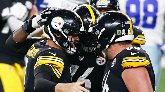 Nov 8, 2020; Arlington, Texas, USA; Pittsburgh Steelers quarterback Ben Roethlisberger (7) and offensive guard David DeCastro (66) and offensive tackle Chukwuma Okorafor (76) celebrate a touchdown in the fourth quarter against the Dallas Cowboys at AT&T Stadium. Mandatory Credit: Tim Heitman-USA TODAY Sports