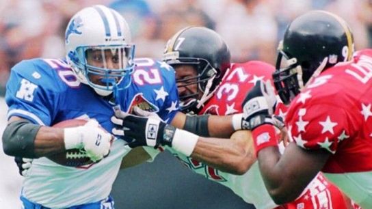 Greg Lloyd, and Carnell Lake attempt to tackle Barry Sanders in 1997.