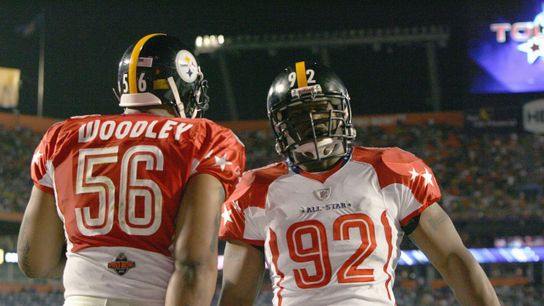 MIAMI GARDENS, FL - JANUARY 31: James Harrison #92 of the Pittsburgh Steelers celebrates with LaMarr Woodley #56 of the Pittsburgh Steelers during the 2010 AFC-NFC Pro Bowl at Sun Life Stadium on January 31, 2010 in Miami Gardens, Florida. (Photo by Doug Benc/Getty Images)