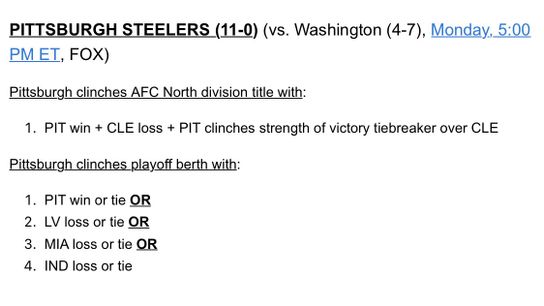 The Pittsburgh Steelers could clinch the AFC North title on Monday night, should the Browns lose and the Steelers win in week 13.