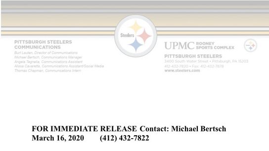 โ Pittsburgh Steelers (@steelers) March 16, 2020