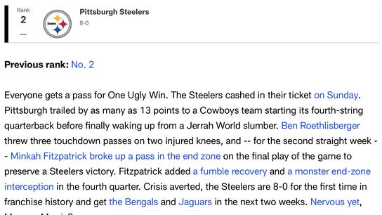 And despite the Steelers maintaining their place in the power rankings, the majority of analysts still question whether or not this is a team that can win it all - whether the Steelers are the team to beat in the AFC, let alone the NFL.