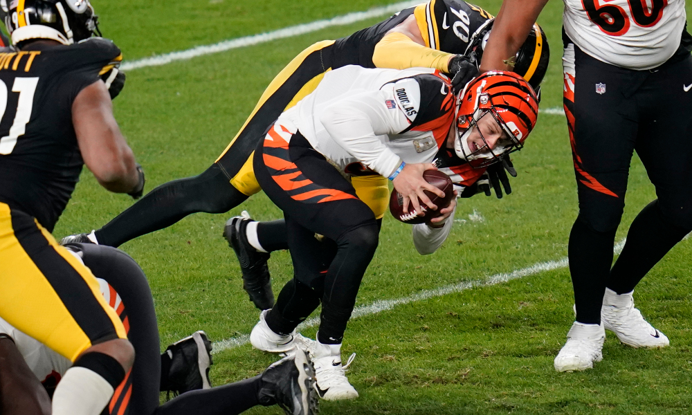 Cincinnati Bengals quarterback Joe Burrow (9) is sacked by Pittsburgh Steelers outside linebacker T.J. Watt (90) during the first half of an NFL football game, Sunday, Nov. 15, 2020, in Pittsburgh. (AP Photo/Keith Srakocic)