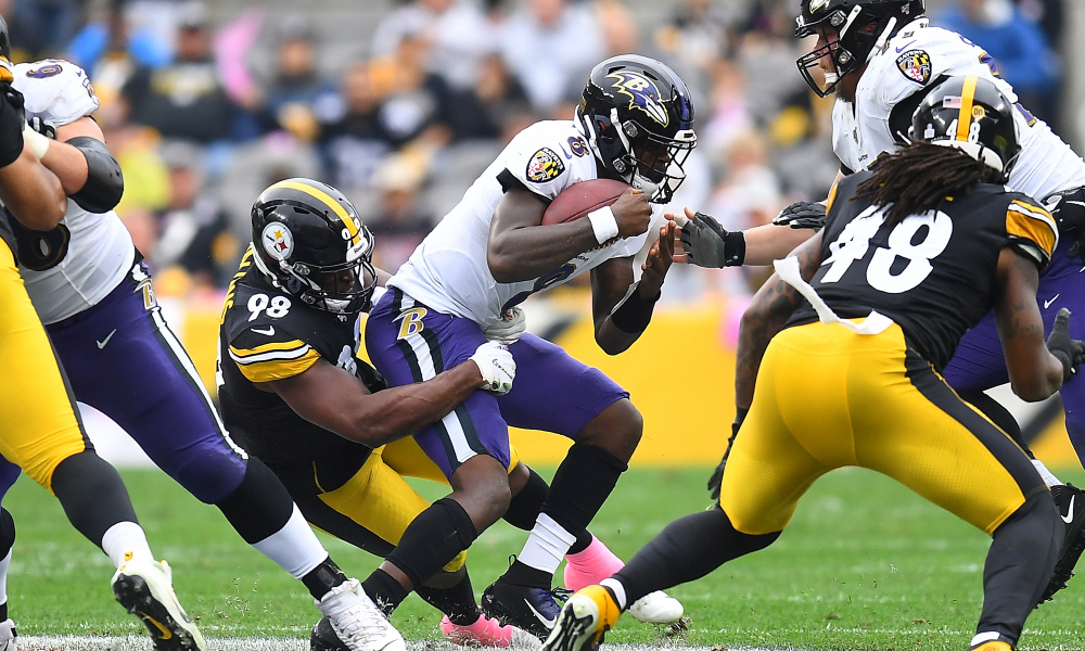 PITTSBURGH, PA - OCTOBER 06: Lamar Jackson #8 of the Baltimore Ravens is sacked by Vince Williams #98 of the Pittsburgh Steelers during the second quarter at Heinz Field on October 6, 2019 in Pittsburgh, Pennsylvania. (Photo by Joe Sargent/Getty Images)
