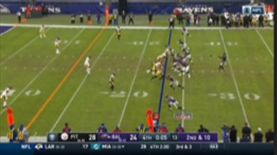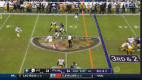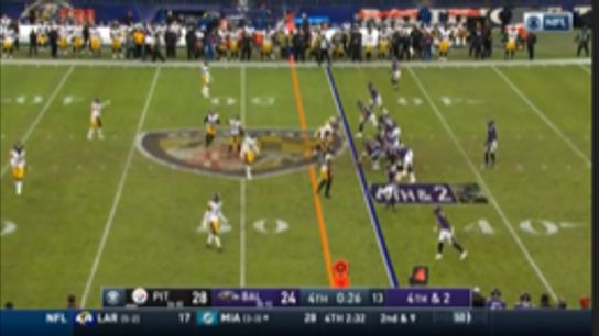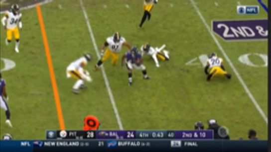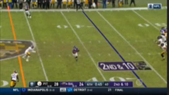 The Ravens formation is similar to the one where they converted on 4th down and it plays out similar as well. Snead does find a spot and Jackson has a dart that looks like its about to hit its target. Prior to the throw, Jackson makes an attempt to get Minkah Fitzpatrick to bite to his left. It doesn’t work as Fitzpatrick is so fast, he actually breaks to the ball faster than Snead and the only thing that preventedFitzpatrick from ending the game with an interception was Snead running into him before he could secure it.