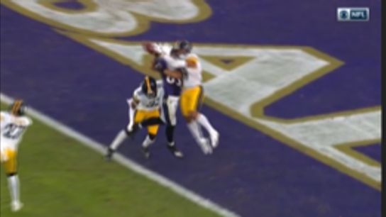 The game is down to 8 seconds and 2 Ravens WRs are heading to the end zone, but Jackson is opting to try and get closer to the end zone by throwing an out route to the top man. TJ Watt completely disrupts the play with immediate pressure and hits Jackson as he's trying to throw and the ball falls harmlessly incomplete with an open Devin Duvernay as the intended target. This was a huge play by TJ Watt, impacting the Ravens final play.