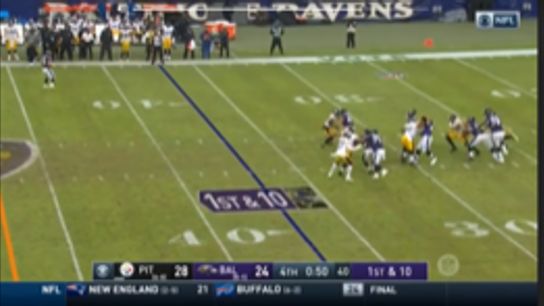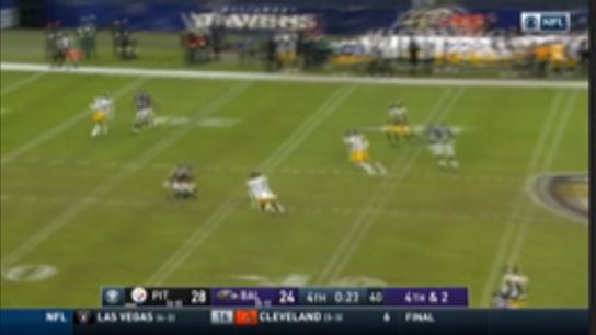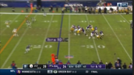 The Ravens again line up similar to the play that they converted on 4th and 2 earlier in the drive. The Steelers again are lined up very interesting here. First, note the Steelers are rushing 4 as they really wanted to get pressure - which has been a huge part of the game play all day. It looks again like a cover-4 zone – although it's played far more aggressive. The idea is to pressure Jackson (who coming off a solid hit by TJ Watt) and force a fast throw as anything short of a TD is a good play for Pittsburgh.