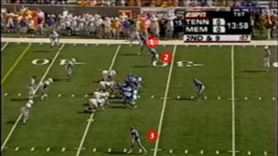 The foundation of Fichtner's offense is the spread formation. From a formation standpoint, the idea is to render the defense vulnerable by spreading them out horizontally with pass formations, then run the ball. As in any spread offense, he'll often have three or four-wide receiver sets; thus giving the opposing defense the idea of pass. In the example seen below from a 2005 game against the University of Tennessee Volunteers, Fichtner's offense is showing a four-wide receiver set. The aspect to take note is the distance between each receiver. Creating this distance forces the cornerbacks to play further away from the line or scrimmage; thus opening holes for the half back. Alternatively, the Tigers quarterback has the option of passing to any of the four receivers aligned on either side. Though it seems elementary, the idea is to deceive, execute and move the chains.